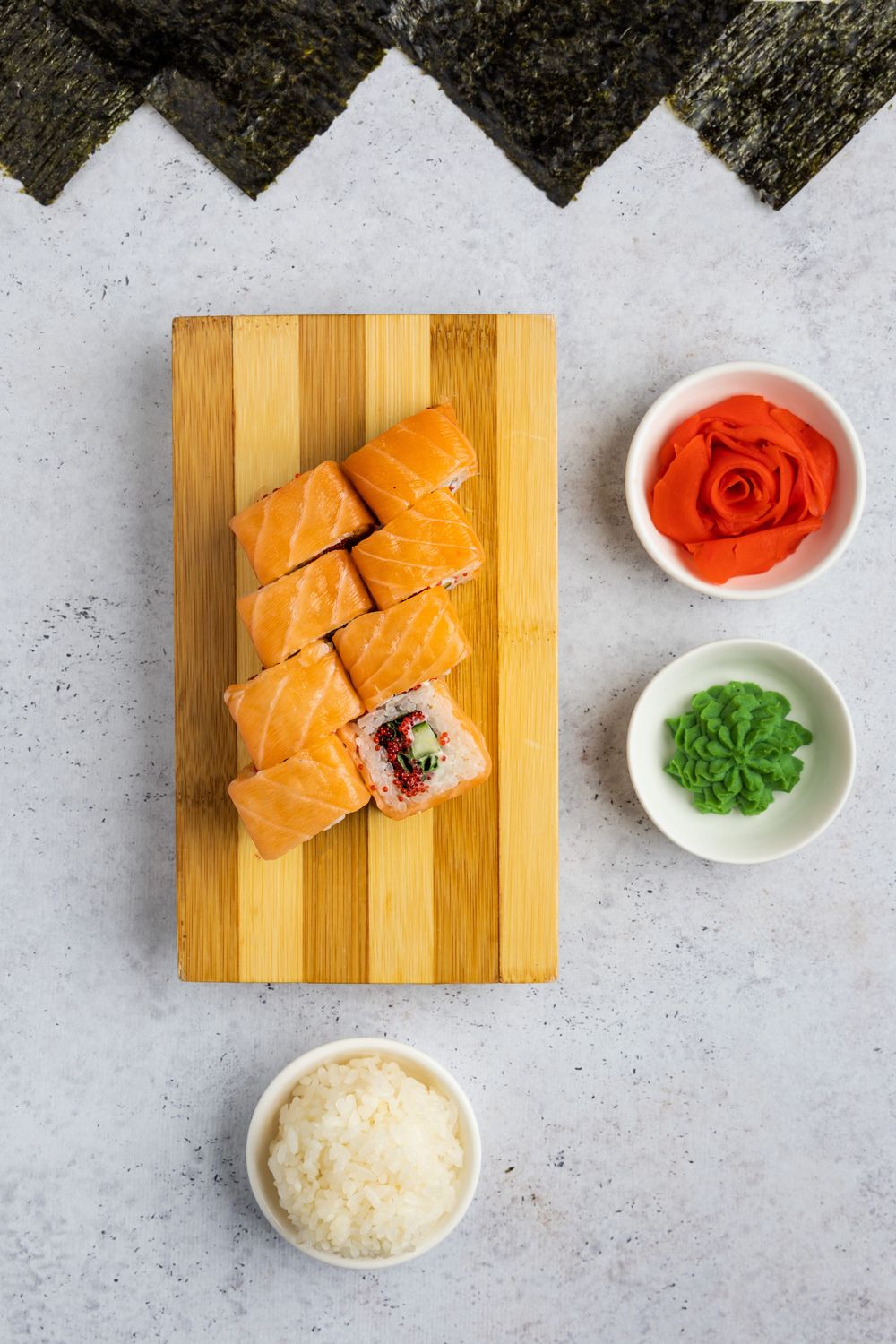 Рис, нори, лосось, лук зеленый, икра летучей рыбы, свежий огурец, сыр творожный