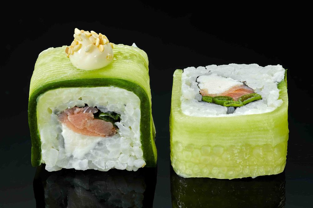 Рис, нори, огурец, лосось х/к, сыр творожный, зеленый лук, майонез, кунжут