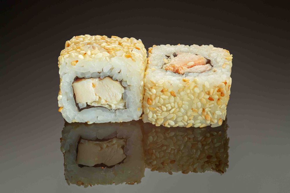 Рис, нори, капуста пекинская, филе копченого цыпленка, соус Цезарь, кунжут