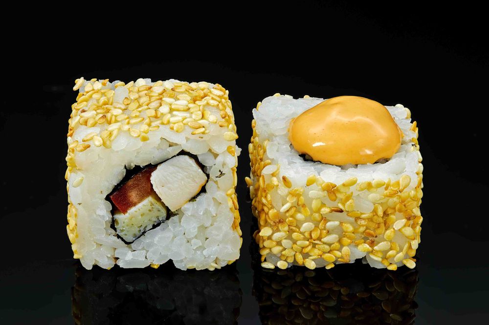 Рис, нори, копченое филе цыпленка, кунжут, помидор, томаго, соус Спайс