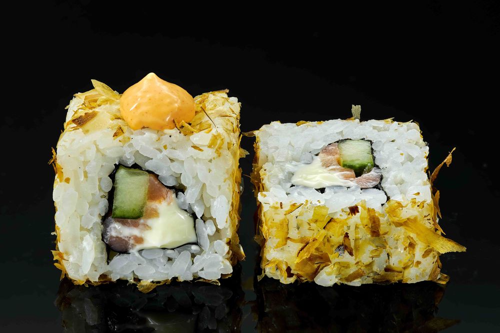 Рис, нори, лосось х/к, огурец, соус Спайс, сыр плавленый, стружка тунца