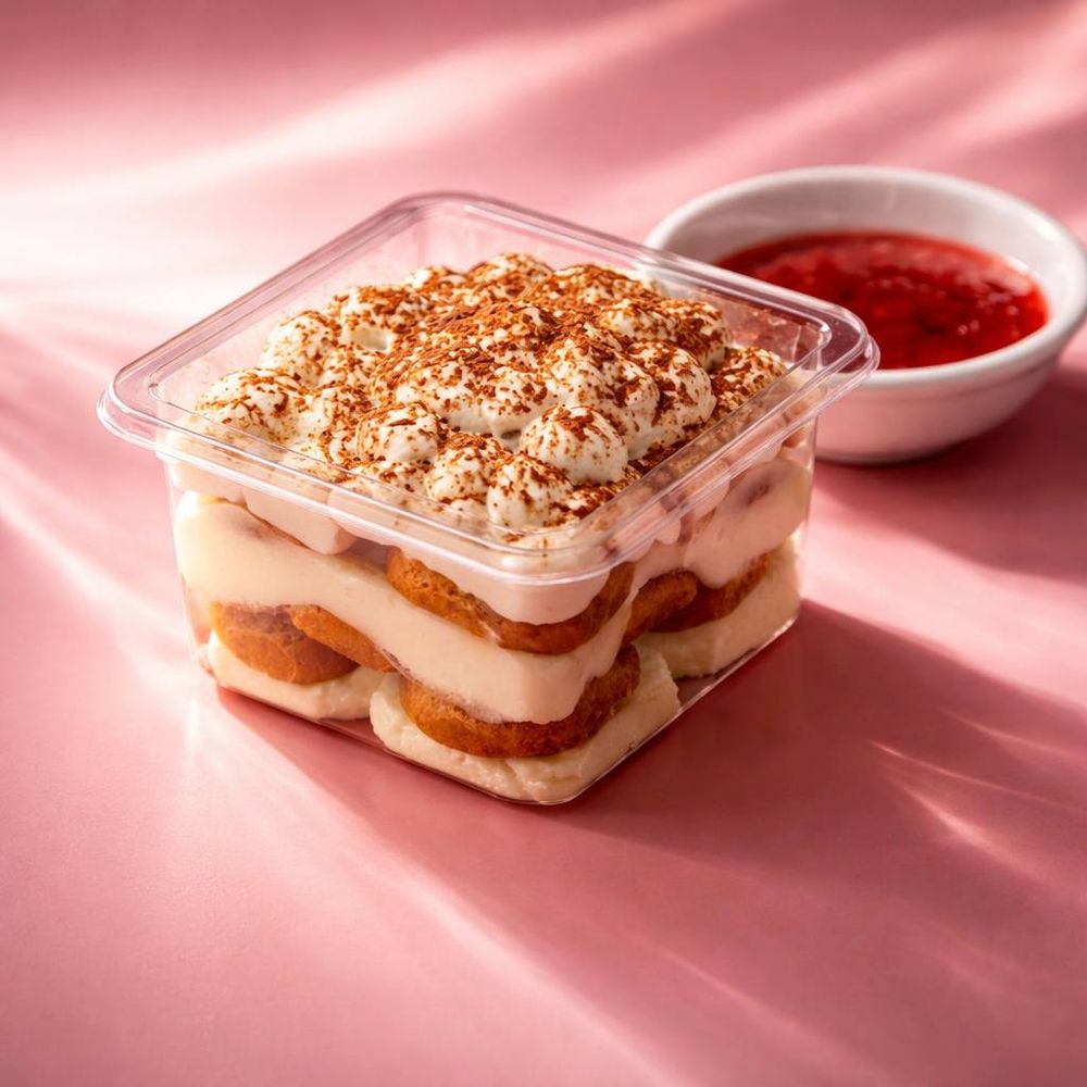 Сахарный бисквит, кофе, сливки, сыр маскарпоне, какао, клубничный соус.