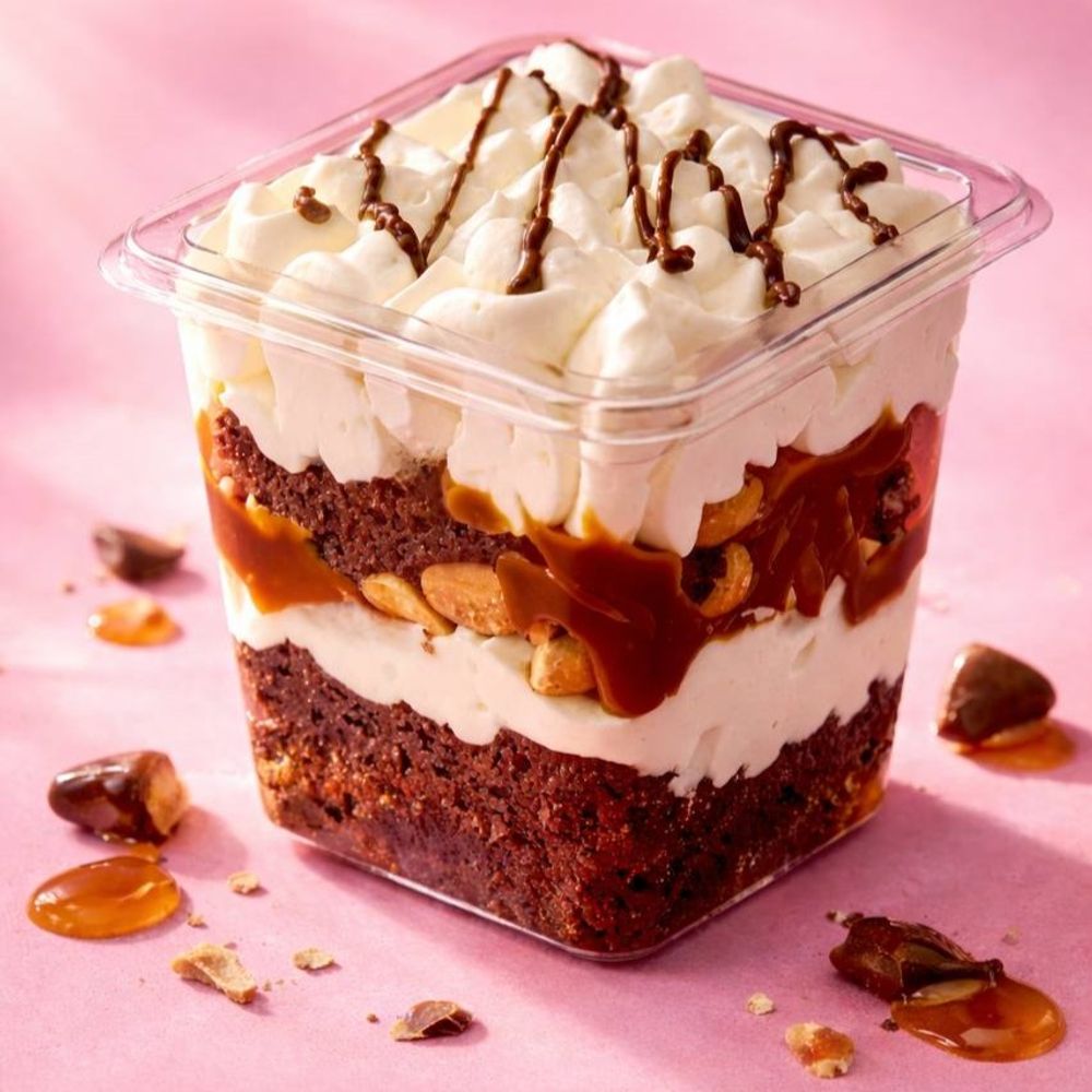Шоколадный бисквит, сливки, сахар, сыр творожный, вареное сгущенное молоко, арахис, шоколад топленый.