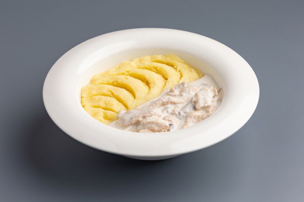 Филе куриное, шампиньоны, лук, сметана, сливки, специи, пюре: картофель, молоко, масло сливочное.