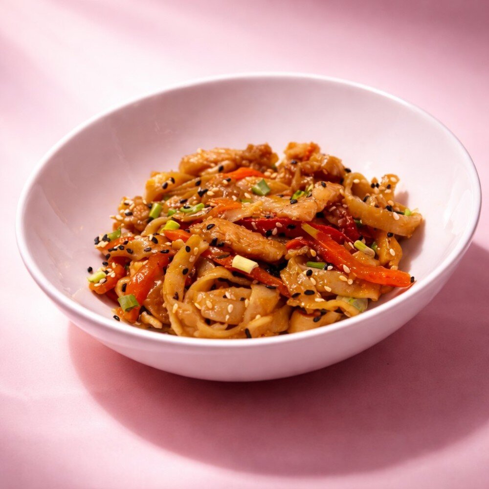 Пшеничная лапша, куриное филе, болгарский перец, морковь, имбирь, чеснок, соевый соус, соус терияки, лук зеленый, кунжут (по желанию).