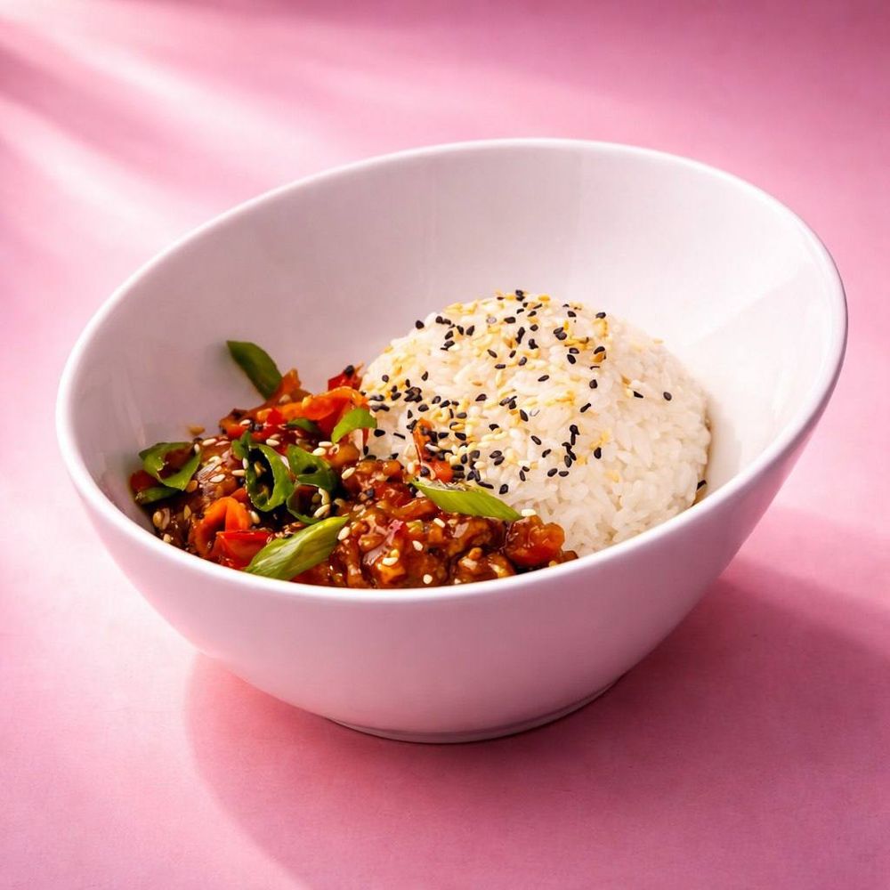 Свинина обжаренная в соусе с овощами, морковь, болгарский перец, чеснок, соус "Сладкий Чили", соевый соус, зелёный лук, гарнир на выбор: рис японский / фунчоза.