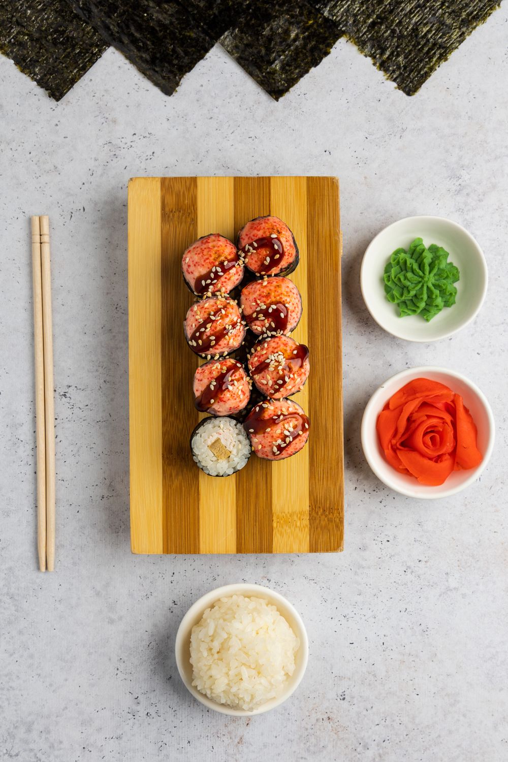Запеченный ролл: рис, нори, снежный краб, омлет томаго, шапка с икрой Тобико, соус Унаги, кунжут