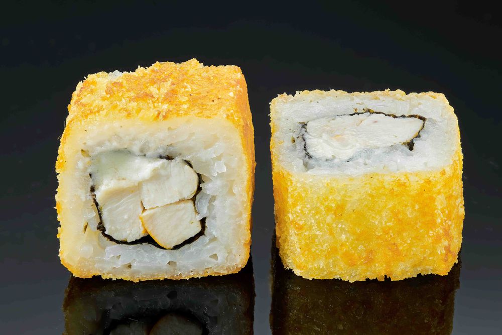 Жареный ролл: рис, нори, грудка куриная копченая, сыр творожный, кляр