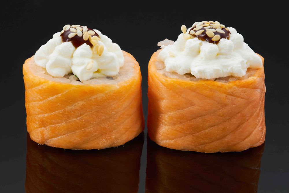 Запеченный ролл: рис, нори, лосось с/м, зеленый лук, сыр творожный, соус Унаги, кунжут