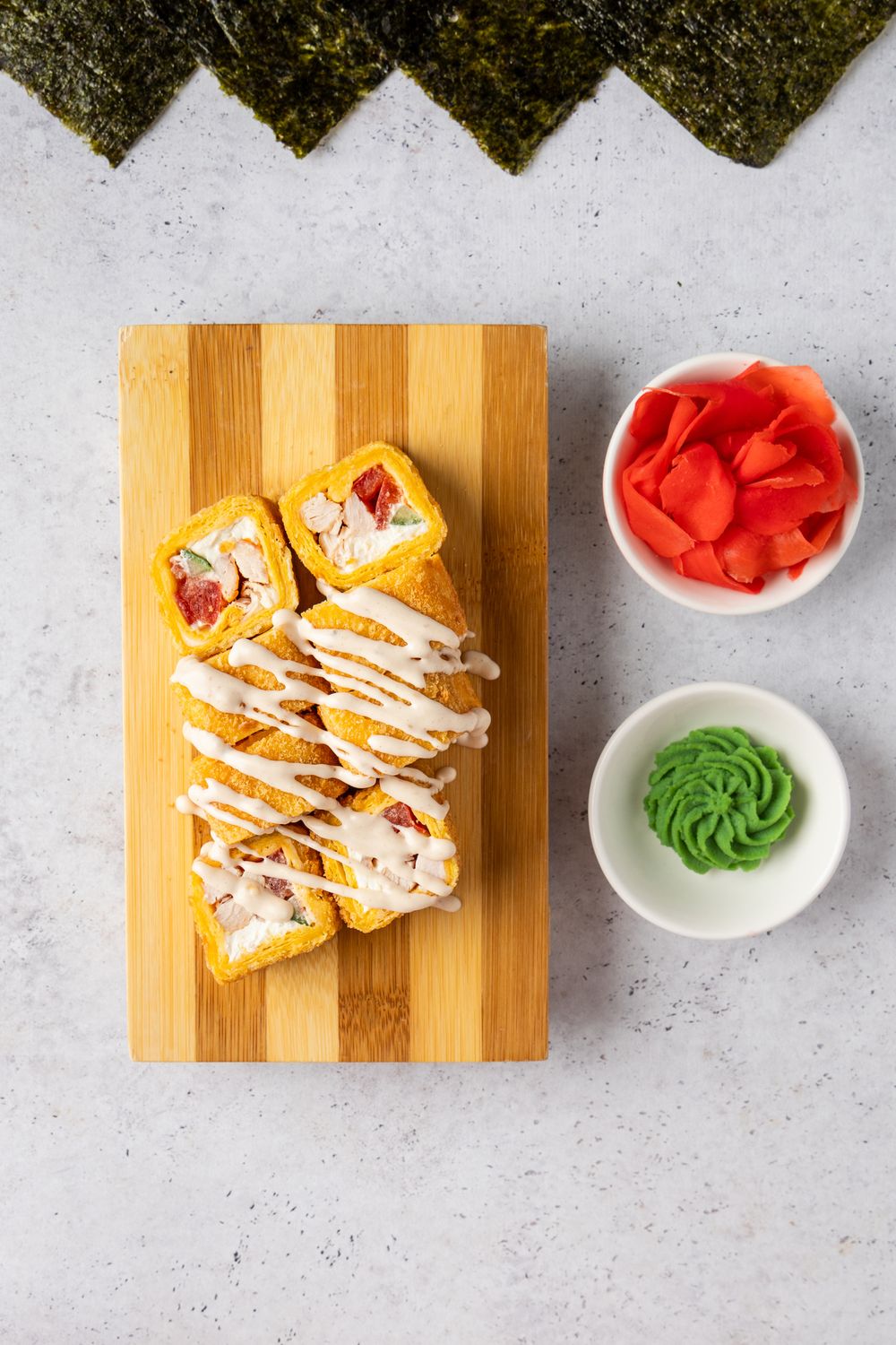 Жареный ролл: мексиканская лепешка, грудка куриная копченая, помидор, огурец, сыр творожный, соус Цезарь, кляр