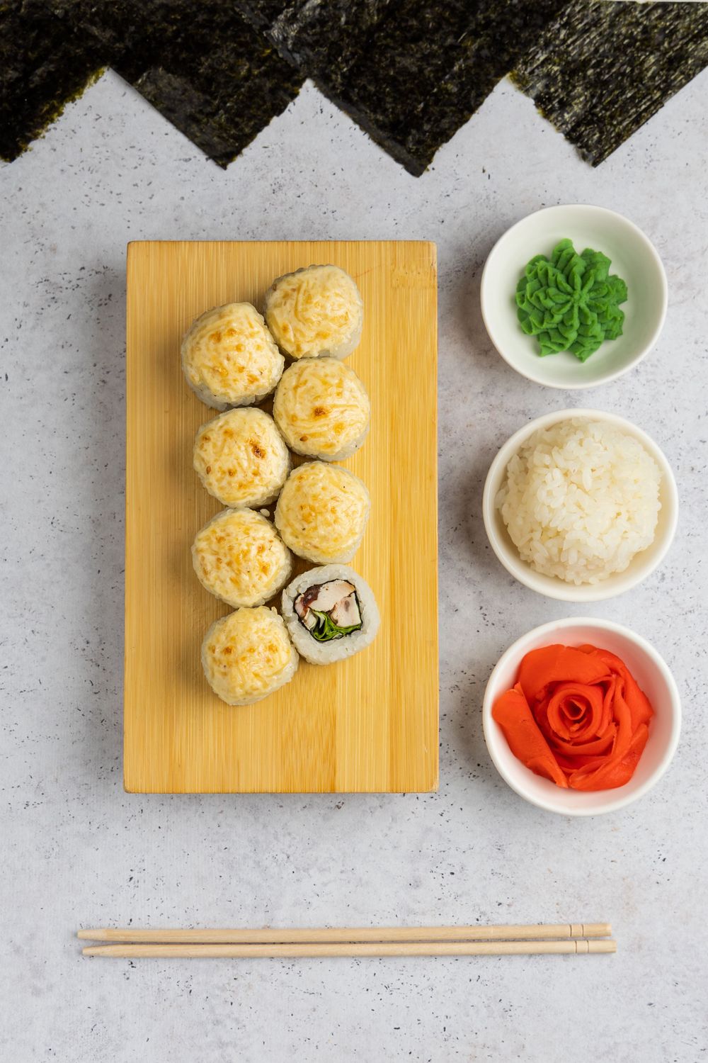 Запеченный ролл: рис, нори, грудка куриная копченая, капуста пекинская, лист салата, помидор, сырная шапка Цезарь