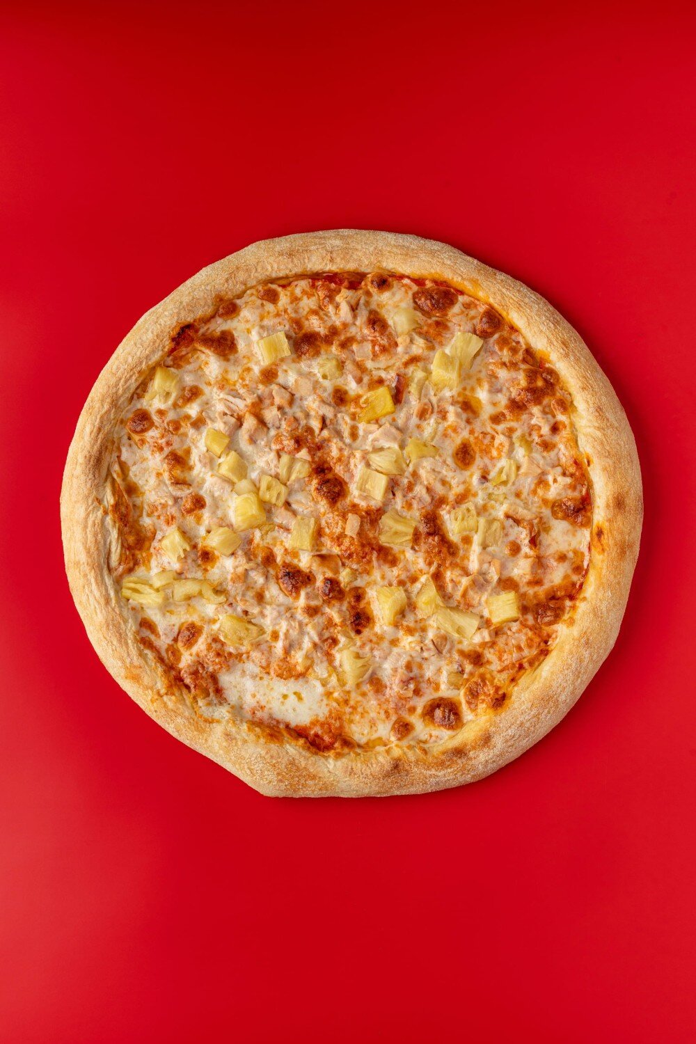 Итальянское тесто, филе куриное копченое, консервированные ананасы, сыр моцарелла, соус дуэт.