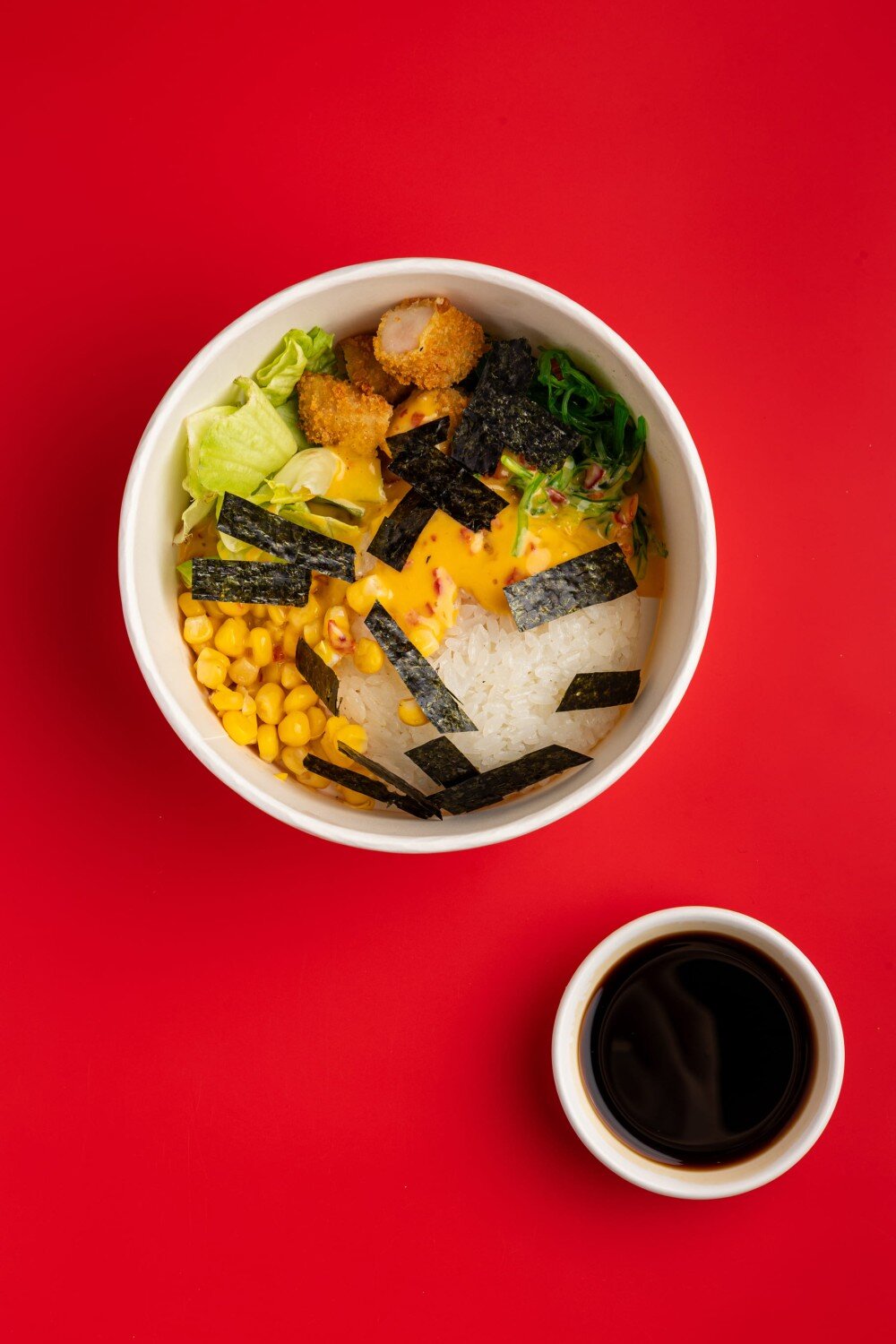 Рис японский, маринованное куриное филе в кляре, салат чука, салат айсберг, кукуруза конс., нори, соус Манго-бэнг, соевый соус.