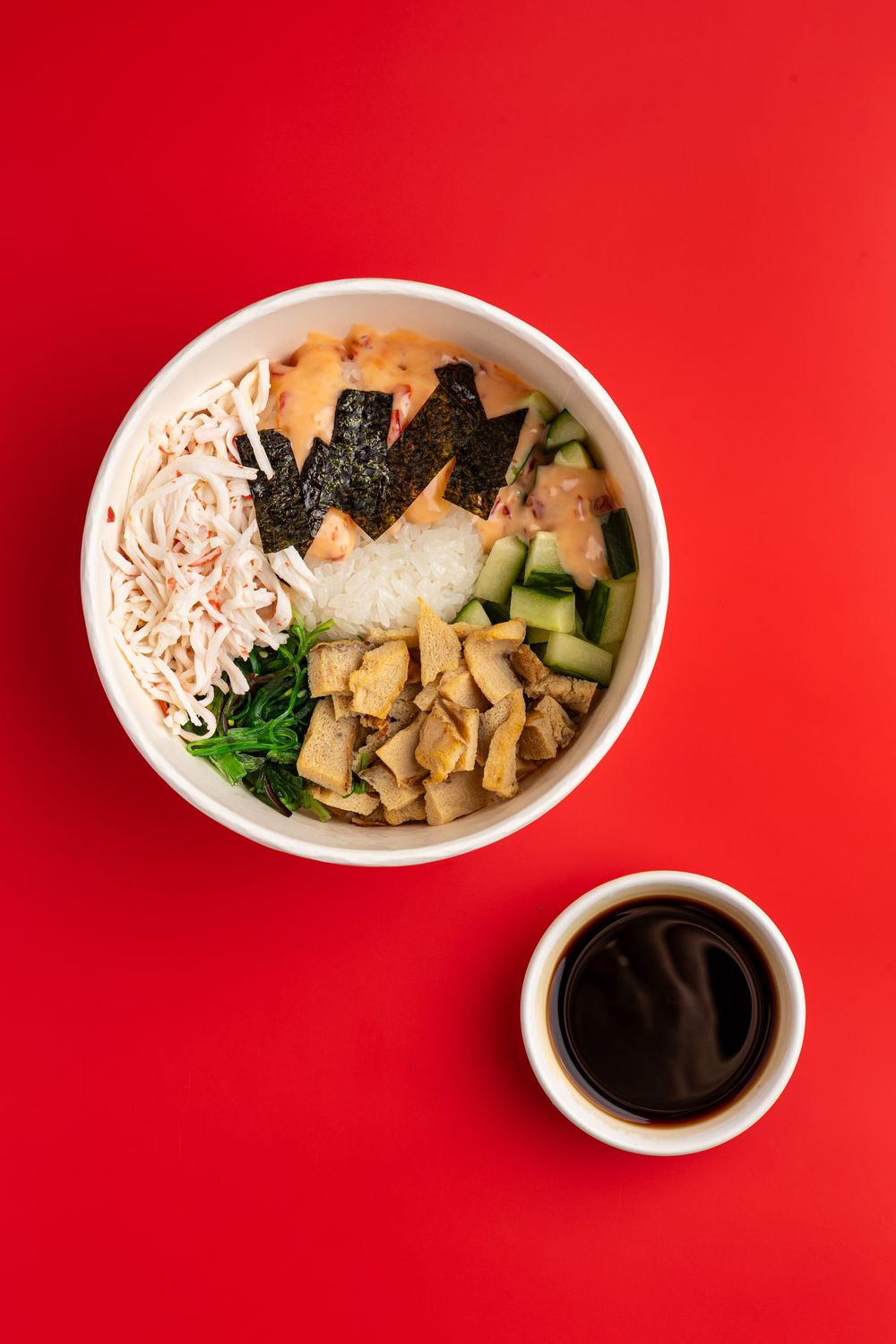 Рис японский, снежный краб, огурец свежий, салат чука, японский омлет томаго, нори, соус Бэнг-бэнг, соевый соус.