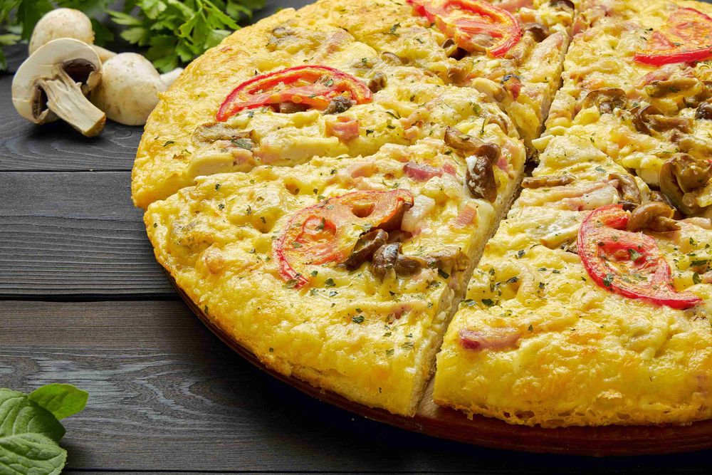 Два вида сыра,майонез, маринованное филе куриное, бекон, помидор, грибы опята, зелень