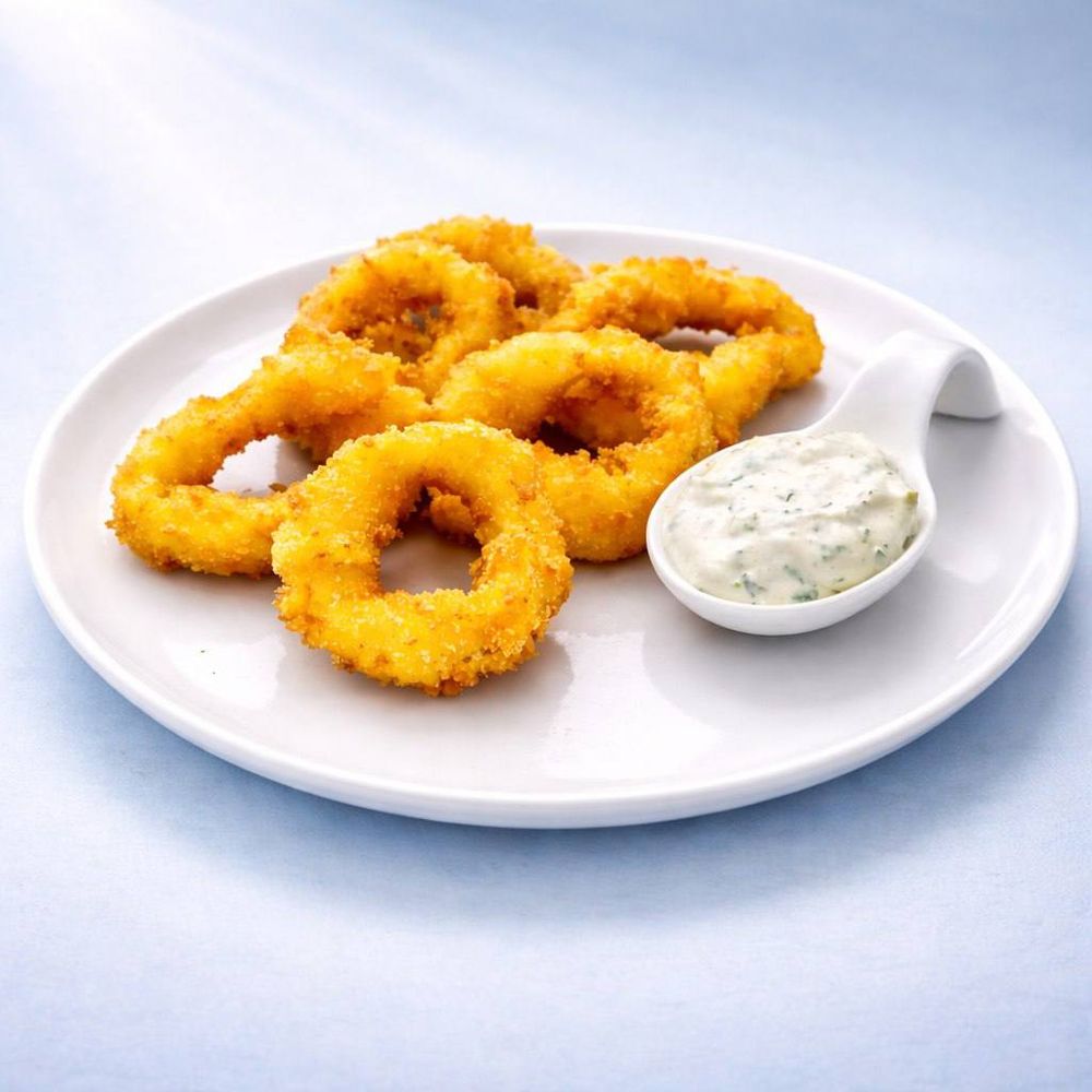 Кольца кальмара в панировке, обжаренные во фритюре, сырно-чесночный соус 30г