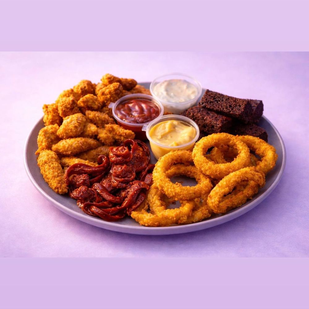 Чикен попкорн, хрустящие палочки краб темпура, баварские колбаски, луковые кольца, гренки чесночные. Включено 3 соуса: чесночный, сырный, мексиканский острый.