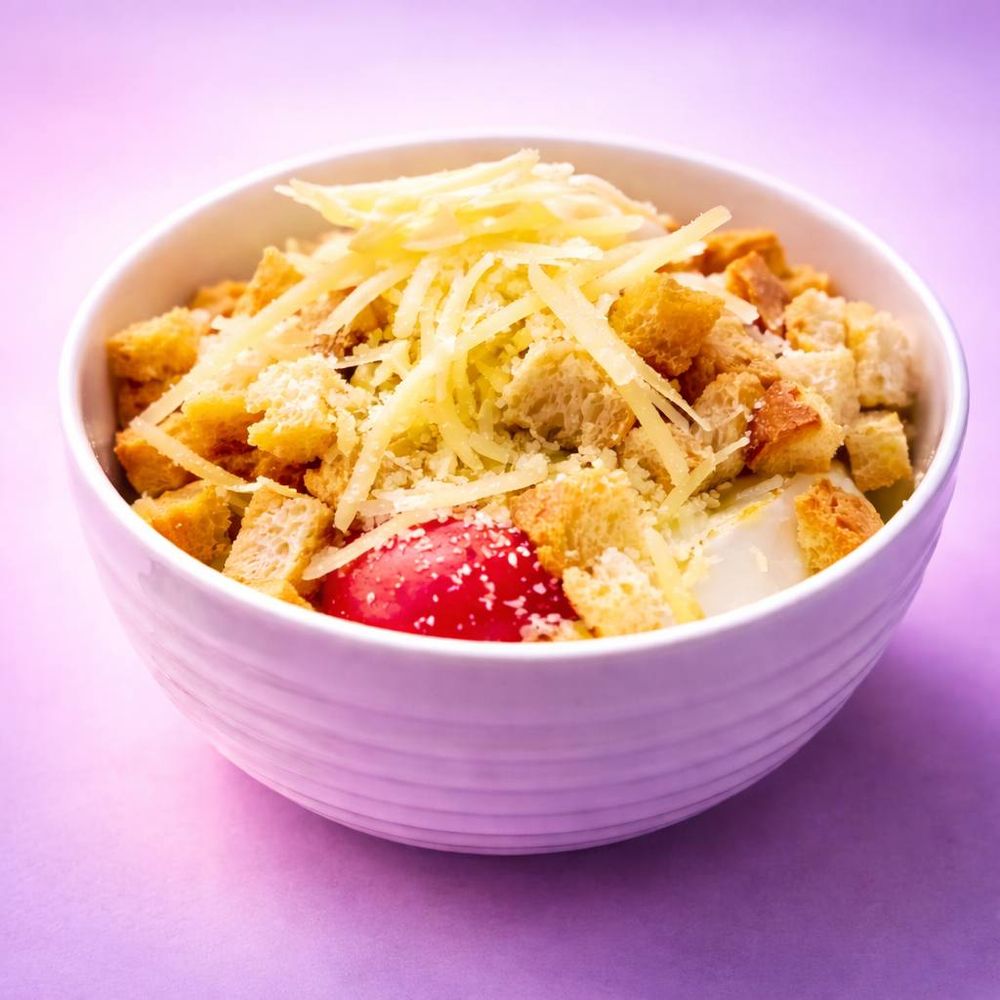 Куриное филе обжареное, томаты черри, капуста пекинская, яйцо отв., сухарики, соус Цезарь, сыр пармезан