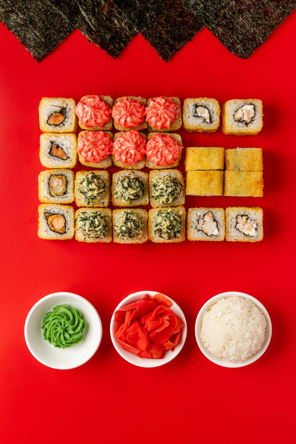3 порции горячих роллов: Лава томаго темпура - жареный ролл с японским омлетом; Эби фри маки - жареный ролл с креветкой; Темпура кунсей - жареный ролл с курицей.