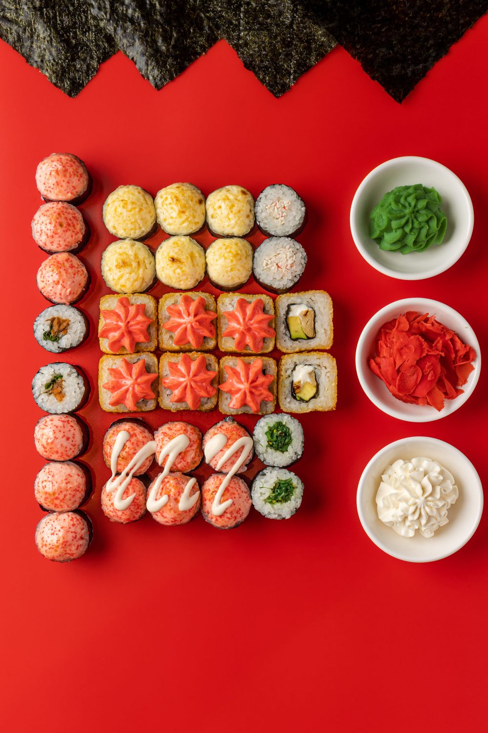 4 порции горячих роллов: Сурими маки - запеченный ролл с крабом; Лава томаго темпура - жареный ролл с японским омлетом; Чука маки гриль - запеченный ролл с салатом чука; Якуси - запеченный ролл с жар. кожей лосося.