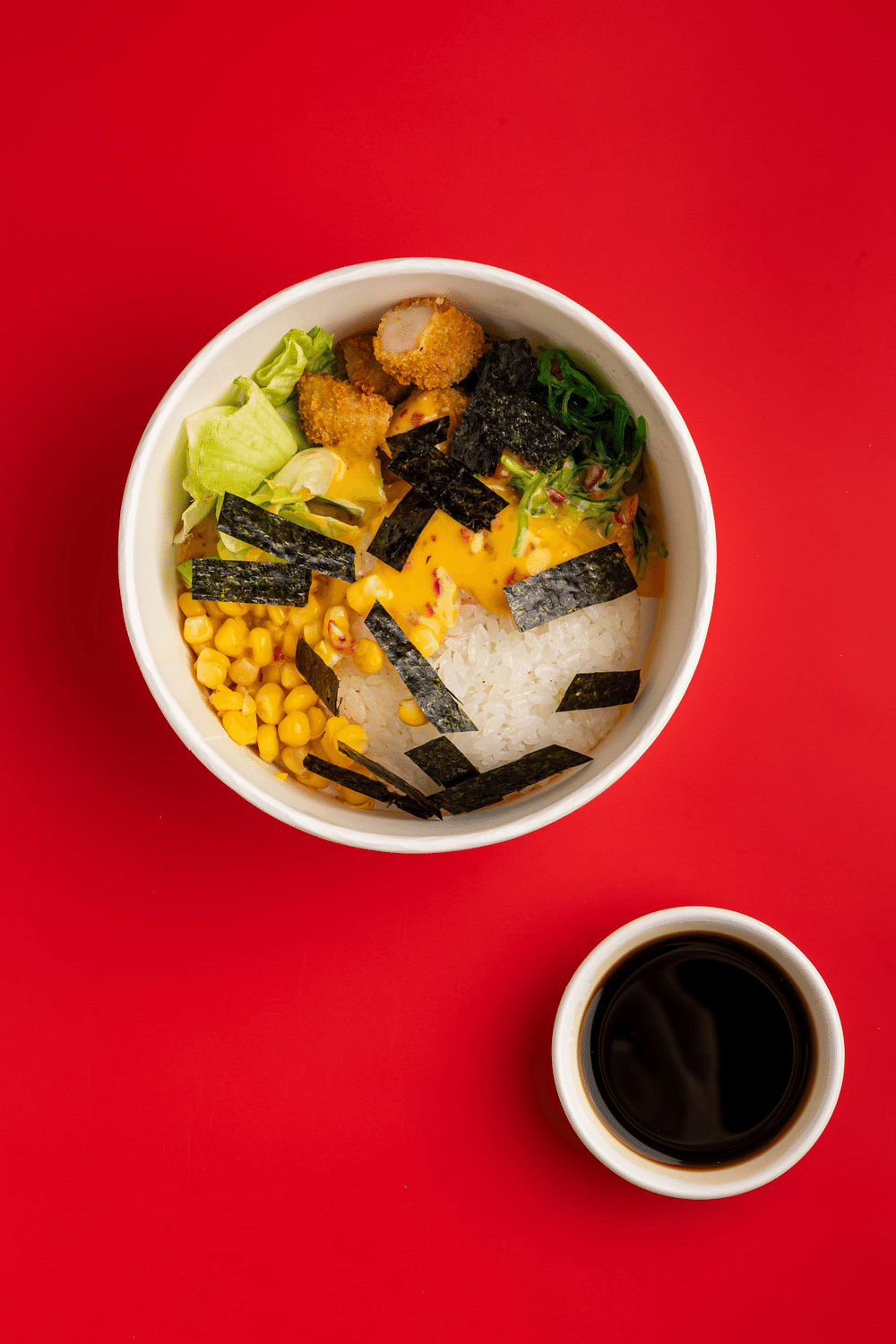 Рис японский, маринованное куриное филе в кляре, салат чука, салат айсберг, кукуруза конс., нори, соус Бэнг-бэнг, соевый соус.