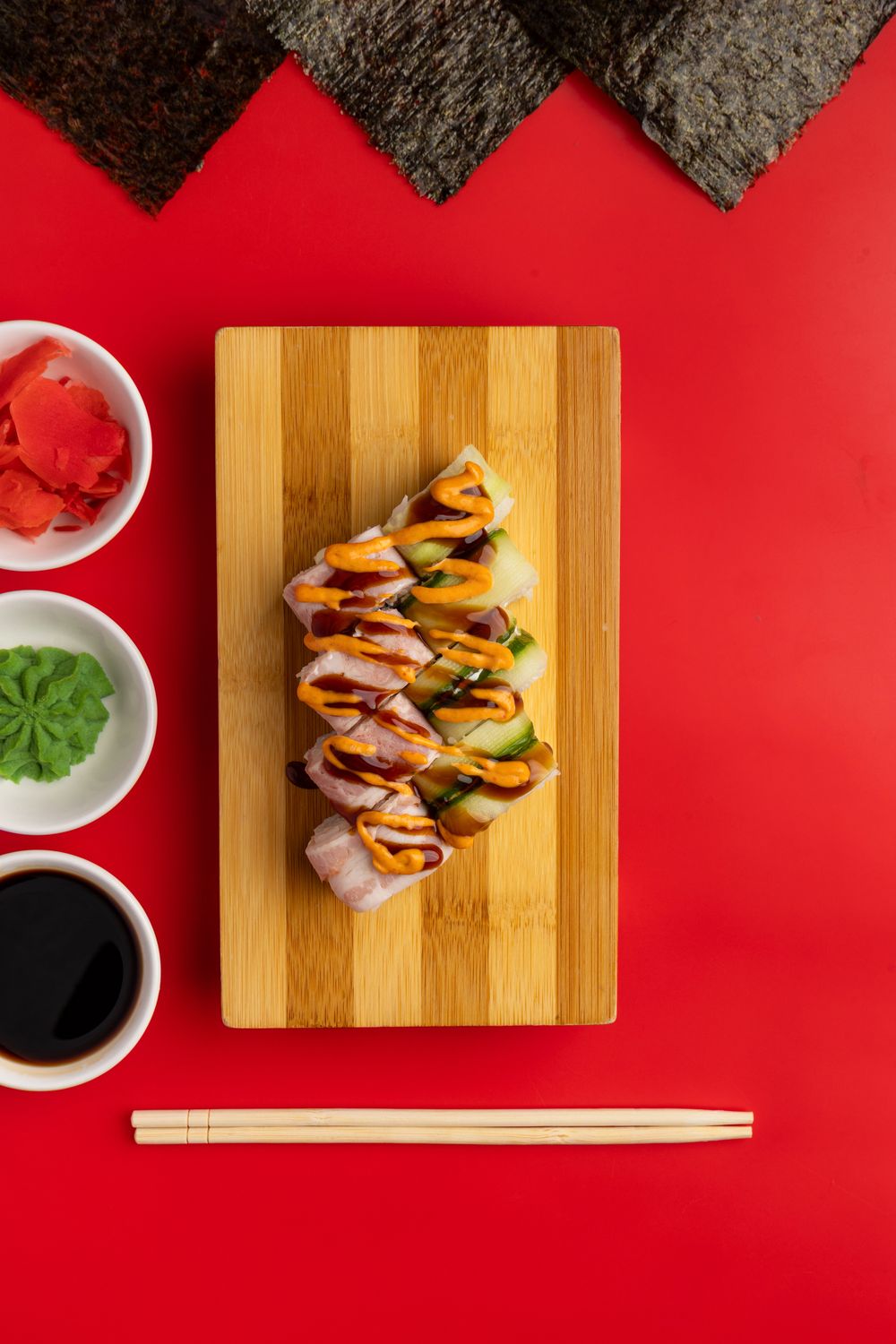 Бекон, огурец, японский омлет томаго, сыр плавленный, лук зелёный, соус Унаги, соус Спайс.