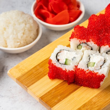 Рис, нори, угорь, сыр творожный, капуста пекинская, соус Спайс