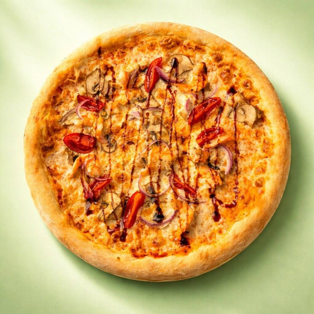 Итальянское тесто, креветки, маринованное куриное филе, помидоры черри, шампиньоны, красный лук, сыр моцарелла, соус Унаги.