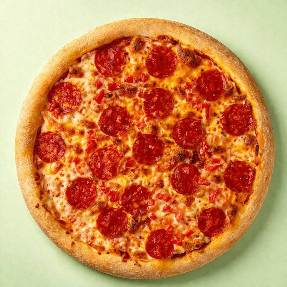 Итальянское тесто, соус томатный, колбаски пепперони, помидор свежий, сыр моцарелла, орегано.